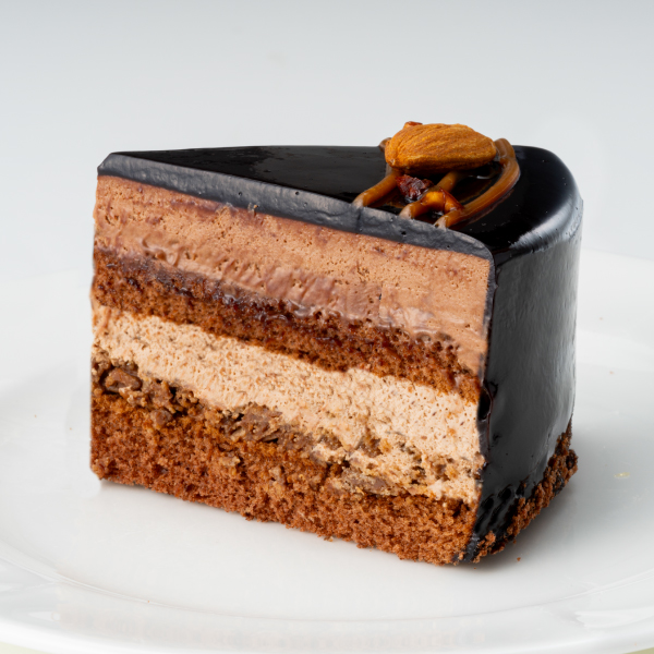 ショコラムース、ヘーゼルナッツショコラシャンティ、キャラメルソースを重ね、食感のアクセントにアーモンド、香りづけにコアントローを使用した贅沢なショコラケーキです。