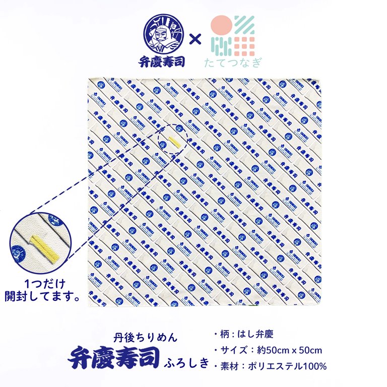 弁慶寿司と言えば箸袋。丹後人のおうちにも必ずあるハズ。そんな箸袋デザインの風呂敷です。一善分だけ袋が破けてます。