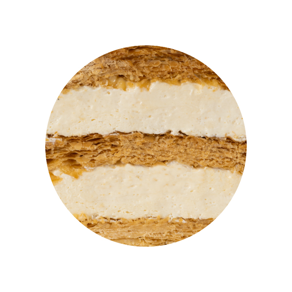 香ばしいパイで練乳入りのカスタードホイップクリームをサンドしました。自工場で生地から仕込んだこだわりのパイに、風味と食感を保つようホワイトチョコレートをコーティングしました。自分で切るのが難しいミルフィーユがあらかじめ切られているのも嬉しいポイントです。