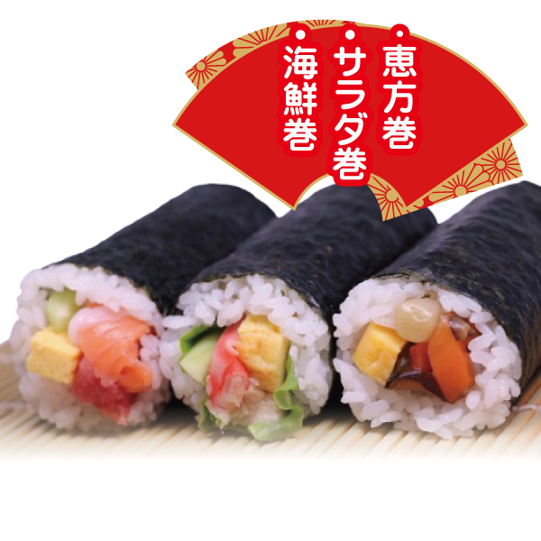 いろんな味が楽しめちゃう♪おすすめセット「笑福恵方巻」と「笑福サラダ巻」と「笑福海鮮巻」の嬉しいハーフセット。