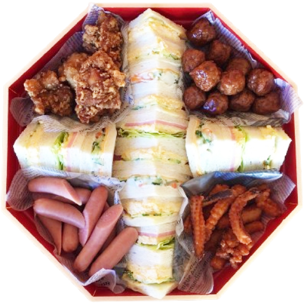 【内容】・たまごサンド(たまご・きゅうり)・ハムサンド(たまご・ハム・レタス)・ポテサラサンド(ポテトサラダ・チーズ・レタス)・唐揚げ・いかの唐揚げ・肉だんご・ウインナー※サンドイッチはすべてマヨネーズ入※季節により内容が変ることがあります。※ご予約状況により予告なく受付を終了する場合がございます。予めご了承くださいませ。※写真はイメージです。