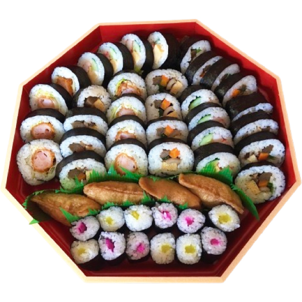 【内容】・田舎巻(たまご・人参・ごぼう・ちくわ・鯖でんぷ・なの花)・ごぼう巻(たまご・人参・ごぼう・ちくわ・なの花)・サラダ巻(たまご・カニカマ・きゅうり・マヨネーズ)・えびカツ巻(えびカツ・レタス・タルタルソース)・いなり・細巻(しんこ・しば漬)