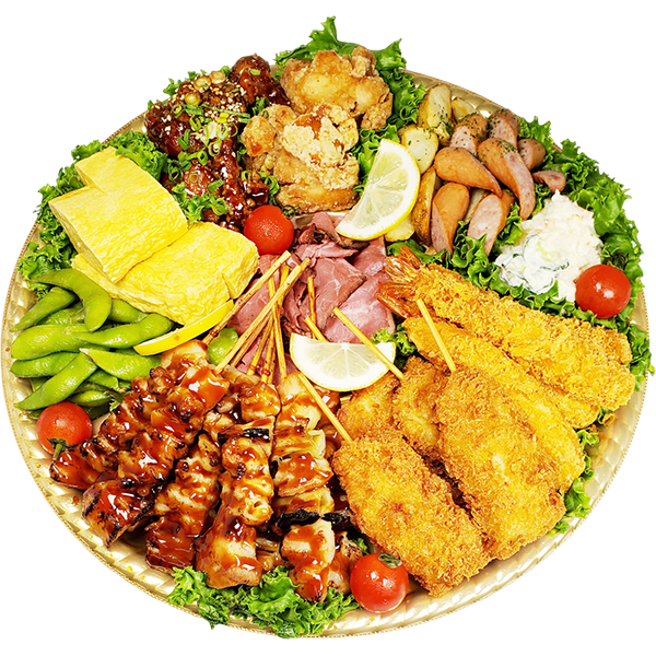 【内容】・ローストビーフ・焼鳥(もも・ねぎま)・豚玉葱串カツ・エビフライ・ポテトサラダ・ウインナーポテト・唐揚げ(プレーン・甘辛)・出汁巻玉子・枝豆【・タルタルソース・ケチャップ・とんかつソース・ローストビーフのたれ(各小袋付)】